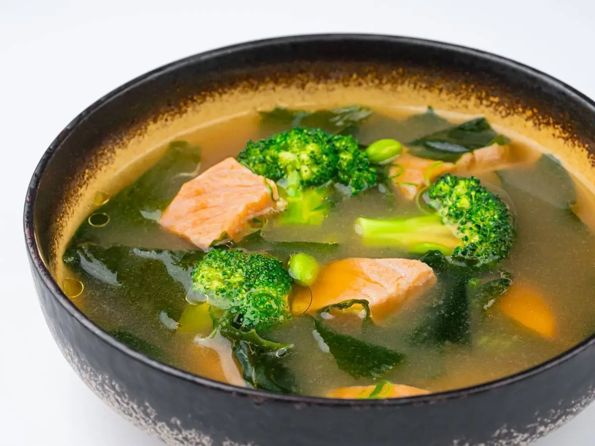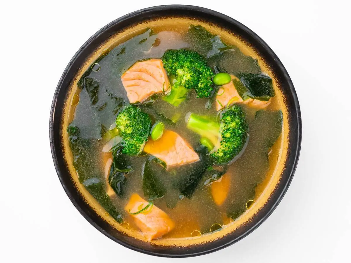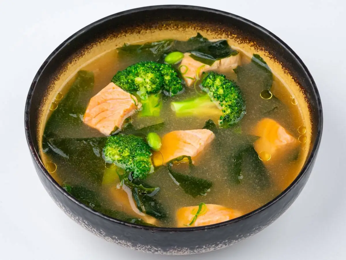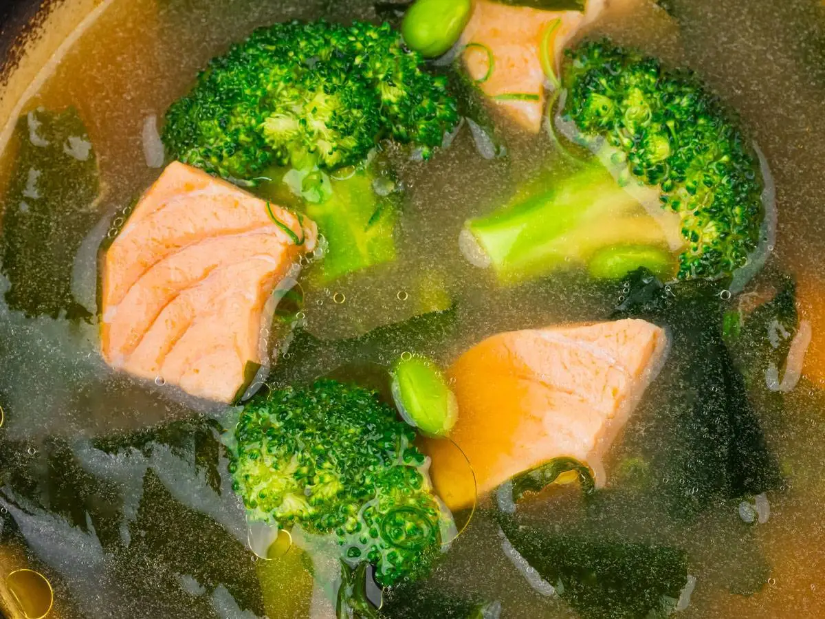 Бульон даши с лососем и брокколи